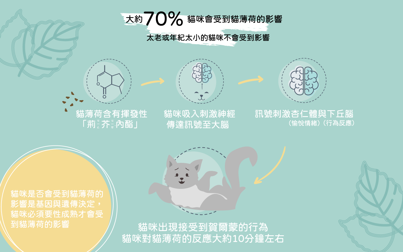 貓薄荷當中的「荊芥內酯」會與貓鼻子中的受體結合,從而刺激與大腦相連的感覺神經元。這種刺激會改變大腦多個與動物情緒調節相關的區域活動,包括嗅覺神經中樞、扁桃腺和下丘腦。不過這也都是假說,真正原因還有待研究釐清,不過貓薄荷中的「荊芥內酯」雖然會讓大多數成年貓產生強烈的興奮感,但是還是有20至30%的喵星人對貓薄荷沒有反應。